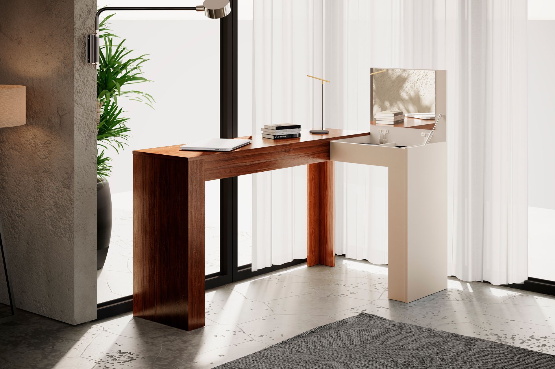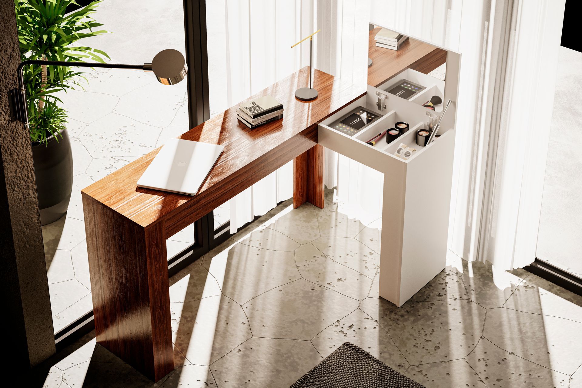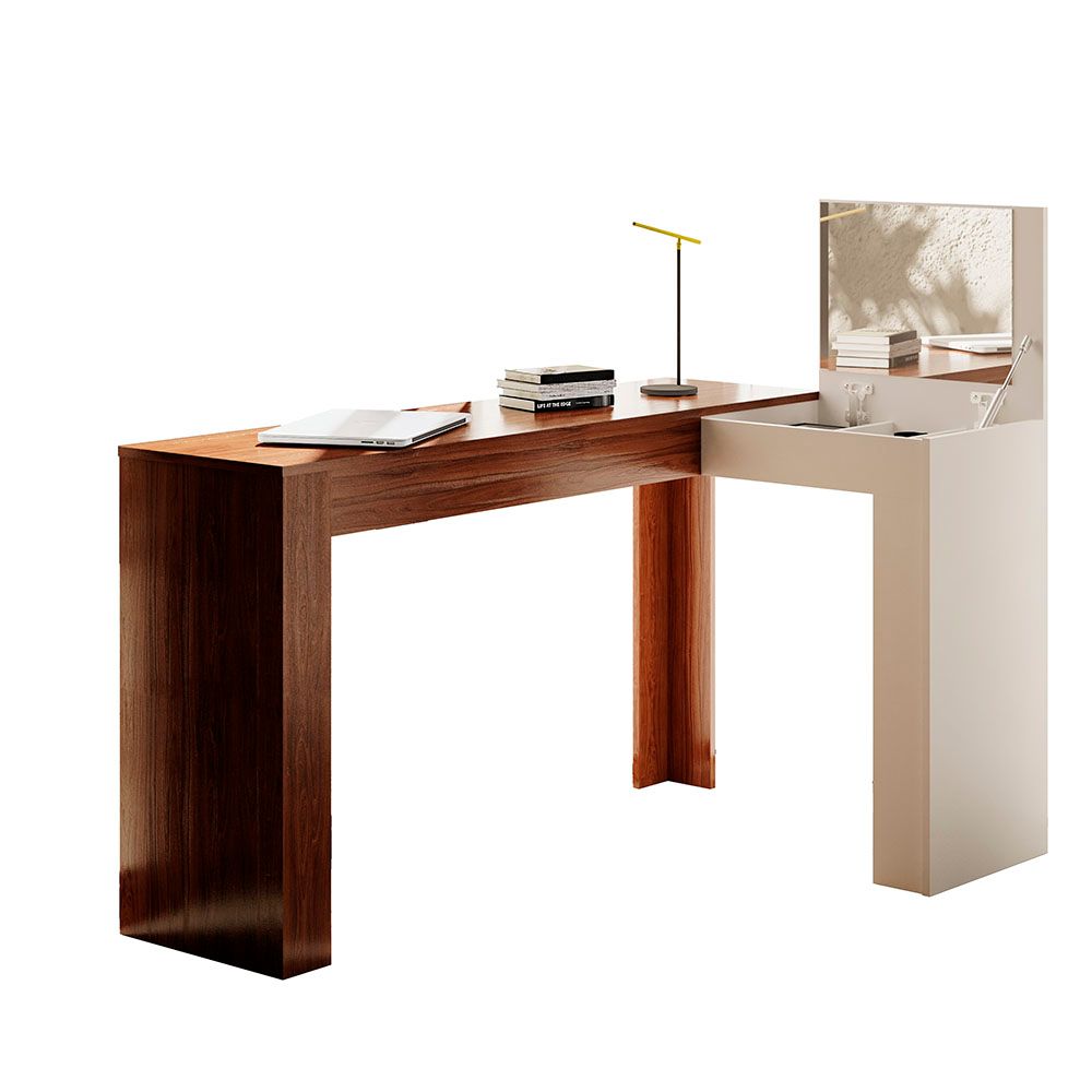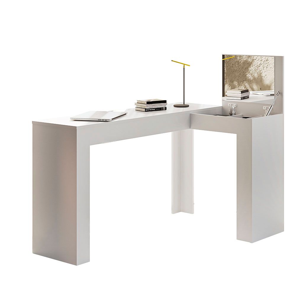 A Escrivaninha de canto com penteadeira Jade tem como destaque seu design moderno e despojado. Além das funcionalidades de uma escrivaninha, possui nicho organizador para objetos e joias, contendo também um painel com espelho fixo. Pois praticidade é tudo, não é mesmo? pintura UV, acabamento fosco. Com a combinação perfeita de qualidade e durabilidade tudo isso para completar sua casa